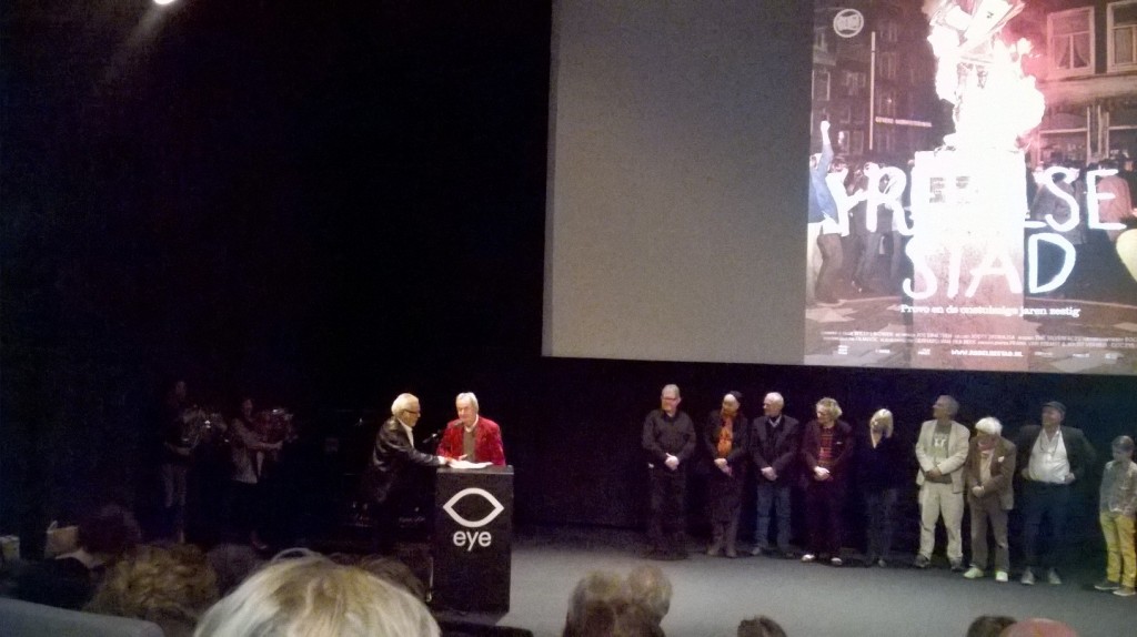 Willy Lindwer en alle oud-provo’s. Links, in rood jasje, Roel van Duijn, oprichter van Provo (Foto: Doortje Smithuijsen)